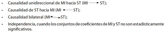 El presente análisis de causalidad se llevará a cabo con la prueba de causalidad de Granger, siguiendo el procedimiento de Toda y Yamamoto (1995), y se abordará en dos partes. La primera estudia la relación entre el mercado interno y los ferrocarriles, y la segunda complementará el análisis con las carreteras, para así evaluar las diferentes hipótesis sobre la relación entre el Sistema de transportes (ST) y el mercado interno (MI). En el anexo A se muestra un cuadro comparativo de los autores que apoyan las diferentes distinciones de causalidad, que se resumen así: